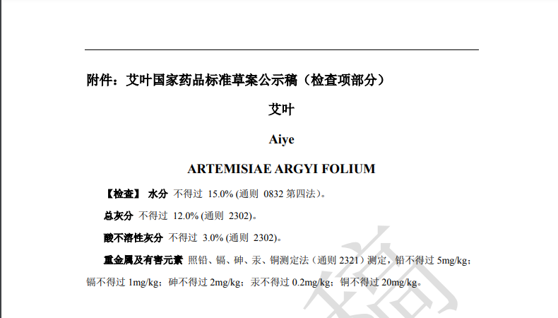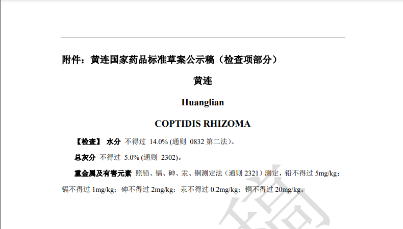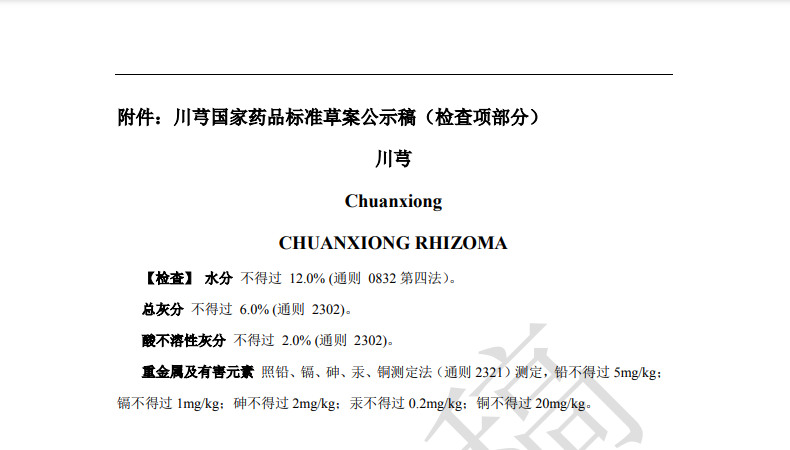 隨著《中藥法典》標(biāo)準(zhǔn)修訂進(jìn)程的推進(jìn),藥典委官網(wǎng)近期陸續(xù)發(fā)布多個標(biāo)準(zhǔn)公示,均與中藥重金屬及有害元素控制相關(guān)。其中,“關(guān)于黃連國家藥品標(biāo)準(zhǔn)草案的公示”、“關(guān)于艾葉國家藥品標(biāo)準(zhǔn)草案的公示”、“關(guān)于川芎國家藥品標(biāo)準(zhǔn)草案的公示”,對相關(guān)檢測項(xiàng)擬進(jìn)行修訂。公示期為30天。通知表示,若有異議,可及時在線反饋,并附相關(guān)說明、實(shí)驗(yàn)數(shù)據(jù)和聯(lián)系方式。
