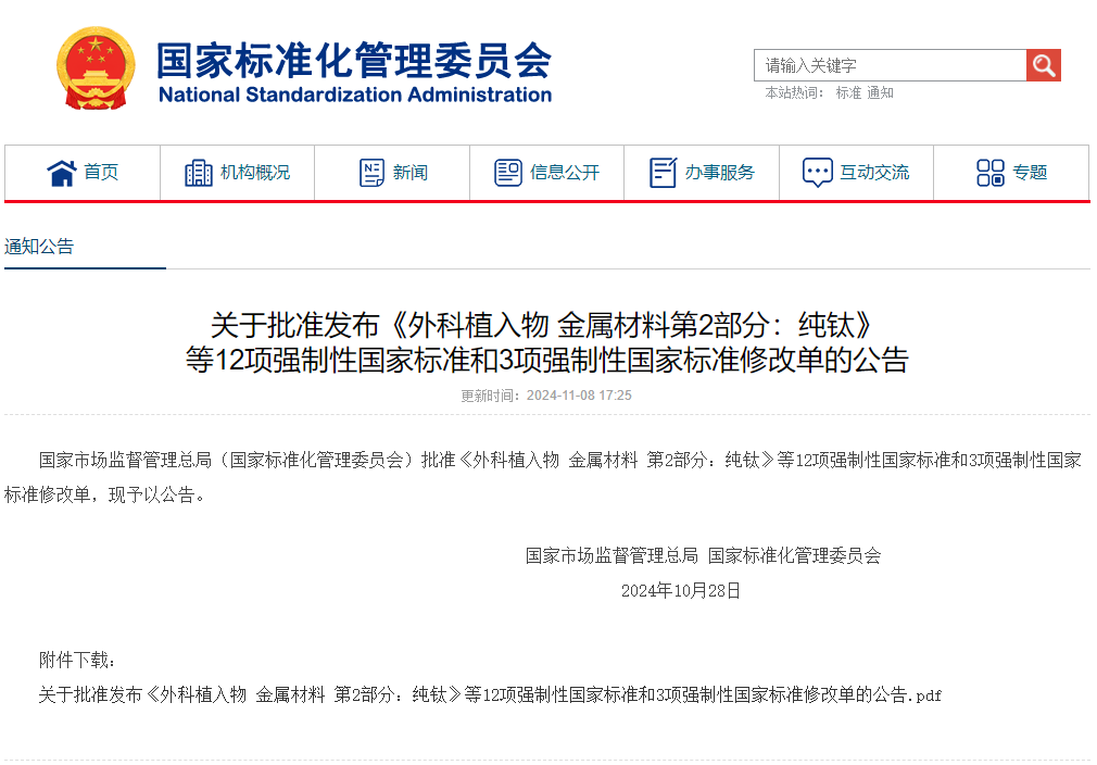 關于批準發(fā)布《外科植入物 金屬材料第2部分:純鈦》等12項強制性國家標準和3項強制性國家標準修改單的公告