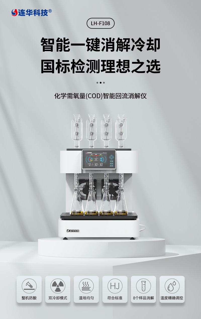 化學(xué)需氧量(COD)智能回流消解儀LH-F108 該儀器依據(jù)國家新標(biāo)準(zhǔn)《HJ828-2017 水質(zhì)化學(xué)需氧量的測定重鉻酸鹽法》設(shè)計(jì)制造,同時兼顧原國標(biāo),適用于各種生活用水和工業(yè)廢水的檢測,儀器內(nèi)置回流系統(tǒng),可智能定時,操作簡單