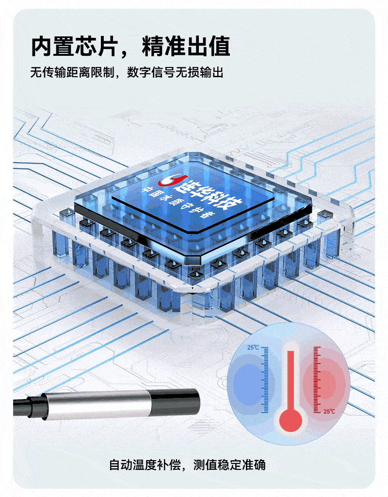 2、采用數(shù)字電極技術,突破傳輸距離限制,默認5米線長(支持定制),結合自動溫度補償功能,確保戶外檢測信號穩(wěn)定、測量精準;