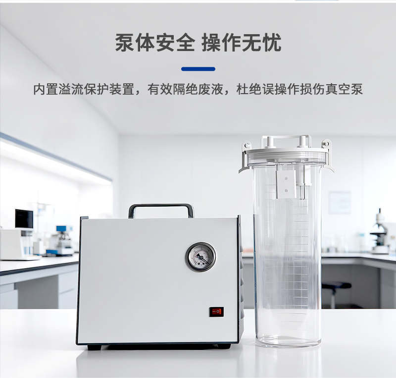 7、過濾系統(tǒng)帶溢流保護裝置,可防止誤操作導致廢液流入真空泵;