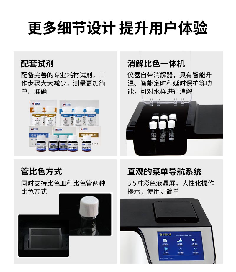 3.自帶消解器:儀器自帶消解器,具有智能升溫、智能定時(shí)和延時(shí)保護(hù)等功能,可對水樣進(jìn)行消解;