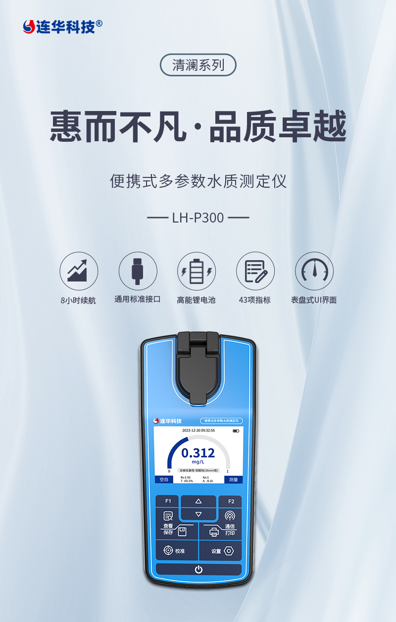 簡要描述: 清瀾系列LH-P300是一款手持式多參數(shù)水質(zhì)測定儀,能夠快速、準(zhǔn)確地測量水樣中的COD、氨氮、總磷、總氮、有機(jī)污染物及無機(jī)污染物等多項(xiàng)參數(shù),儀器小巧輕便,操作簡單功能齊全,具有極高的性價(jià)比。經(jīng)典連華家族式動(dòng)態(tài)表盤界面,量程超限紅色警示,內(nèi)置大容量鋰電池,采用Type-c標(biāo)準(zhǔn)接口,續(xù)航持久,充電、數(shù)據(jù)傳輸都非常方便。