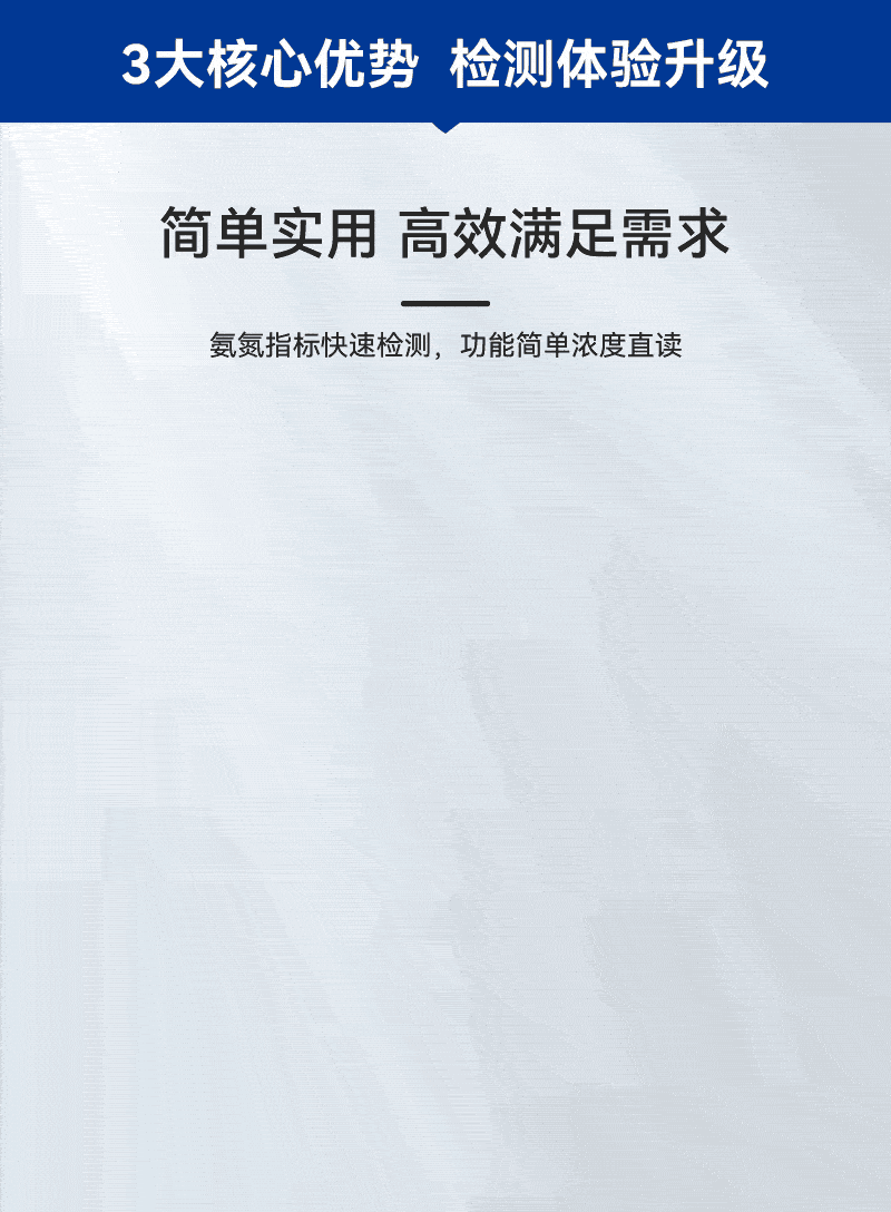 1、簡單實用高效滿足需求,氨氮指標快速檢測,功能簡單濃度直讀